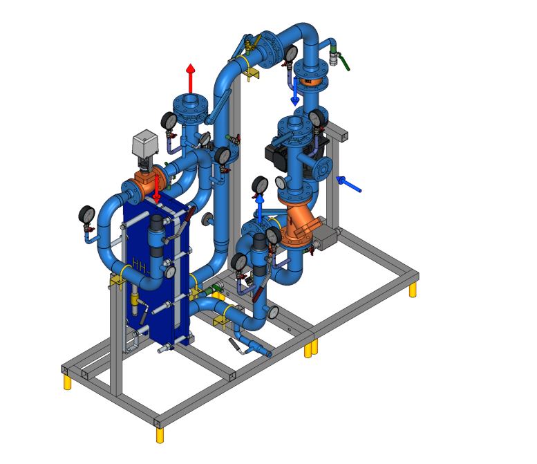 Стандартный тепловой пункт для независимой системы отопления (вентиляции) с резервом теплообменников, двухходовым регулирующим клапаном и резервом насосов 2х100%